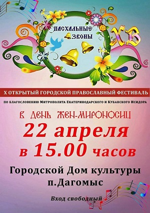 22 апреля 2018 Фонд принял участие в организации открытого городского православного фестиваля «Пасхальные звоны», проводимый в ГДК «Дагомыс» по благословению митрополита Екатеринодарского и Кубанского Исидора. В честь десятилетия фестиваля для всех участников в фойе Дома культуры Фонд организовал чаепитие со сладкими угощениями. Каждый год в фестивале принимают участие более 300 детей из разных воскресных школ побережья, а зрителями его становятся многодетные. малоимущие семьи, и семьи с особенными детьми.